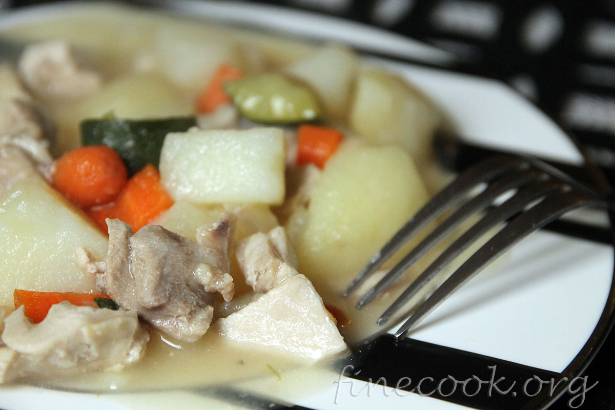 Так как в ингредиентах указана вареная курица, то как раз бульон, в котором вы её отваривали можно использовать для рагу. - Лук почистить и порезать - Картофель почистить и порезать на кусочки (~1 см) - Морковь почистить и порезать на кусочки - Кабачок порезать на кусочки